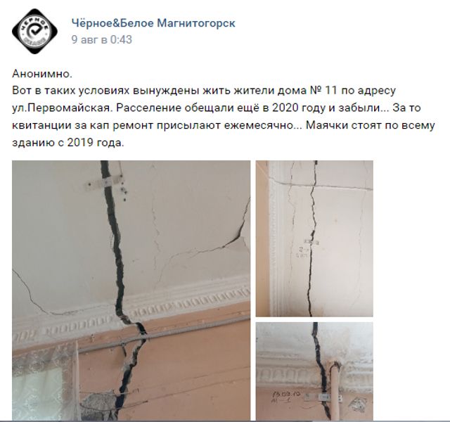 «Трещины повсюду и в комнатах, и в коридорах. Все рушится, сносить не хотят. Мыши лазиют, тараканы по всюду. Замучались выводить. Да и еще вода испорчена, как детей купать! Ужас какой-то! Только не нужно марали читать, на з/п 10-15 тыс. рублей ипотеку не взять!», – писали магнитогорцы в социальных сетях в июне 2021 года.