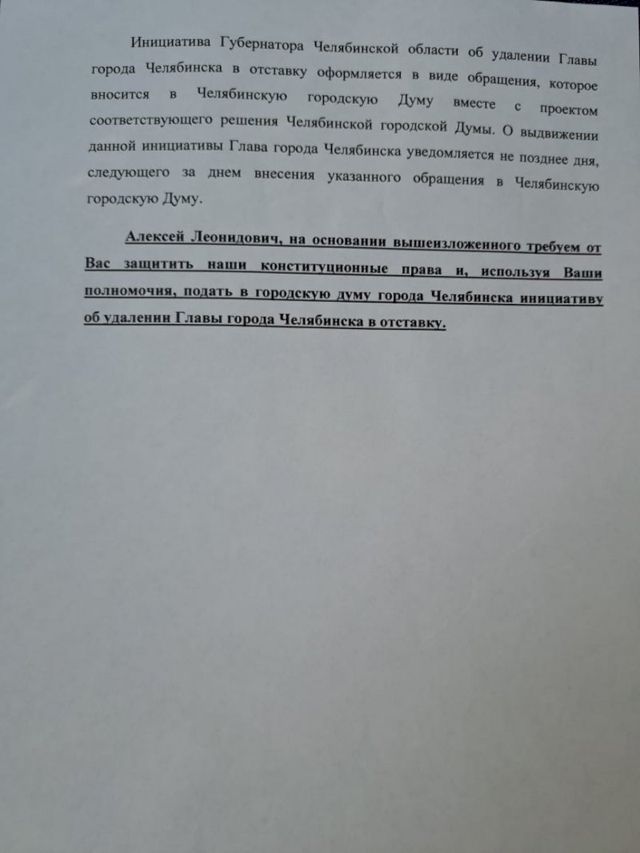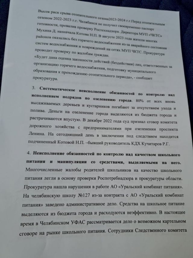К сбору подписей под заявлением об отставке главы Челябинска Натальи Котовой кроме жителей Центрального, Калининского и Ленинского районов подключаются горожане из Металлургического и Советского. В каждом есть свои инициативные группы. Они уверяют, что это не спланированная акция, а желание горожан привлечь внимание властей к проблемам застройки, ЖКХ, озеленения и благоустройства мегаполиса. Всего в тексте обращения к губернатору Алексею Текслеру с просьбой инициировать отставку мэра - аргументы и требования на девяти листах.