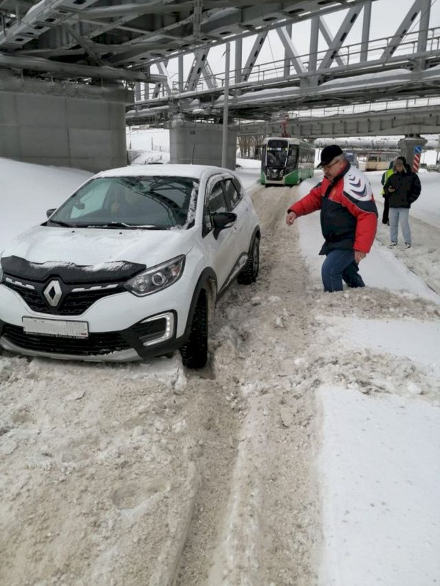 Торопливый челябинский водитель заплатит за простой трамваев. В среду, 7 февраля, он на автомобиле Renault не захотел стоять в пробке на заснеженной дороге и решил объехать затор по рельсам, но у него не получилось.