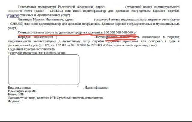 ТАСС опубликовало постановление о наложении ареста на счета и активы родственников экс-губернатора Челябинской области Михаила Юревича и бывшего депутата Госдумы Вадима Белоусова. На третьем фото документа судебных приставов указана та самая сумма, которая более чем в три раза превышает доходы бюджета России за 2023 год, - 100 трлн рублей. По информации BRIEF, указанная сумма превышает рублевую денежную массу в обращении: на 1 марта она составляла 99,4 трлн рублей (данные ЦБ).