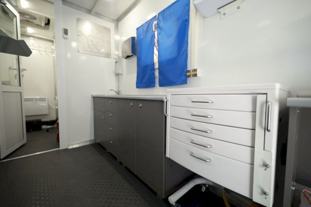 В кузове есть несколько отсеков: помещение приема пациентов, непосредственно стоматологический кабинет, оснащенный современным оборудованием и расходными материалами, рентген-аппаратом, технический блок с генератором, санитарная комната. Две таких мобильных стоматологии передали военным из чебаркульской 90-й танковой дивизии.