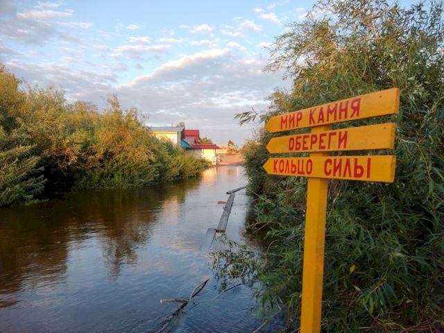 После проливных дождей поднялся уровень реки. Она разлилась на территории заповедника. Вода продолжает прибывать. Затопило магазины, тропу на Шаманку. В некоторых местах затруднен проезд с правого берега.