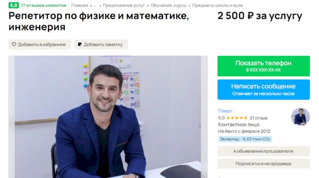 Есть и настоящие универсалы. Например, Максим утверждает, что успешно готовит детей по таким дисциплинам, как математика, физика, биология, химия. В его объявлении говорится и о занятиях по английскому, биологии, обществознанию и даже китайскому языку. Правда, за такими предложениями нередко скрывается не один репетитор, а целые онлайн-школы или курсы. Иногда внутри объявления они дают о себе знать, но бывает, что и нет.