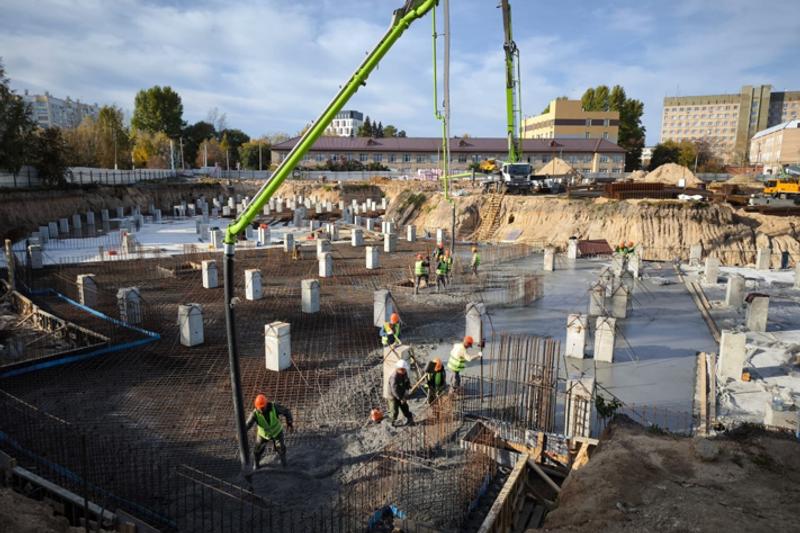 Работы выполнены почти на 60%. Завершить заливку фундамента планируют к середине ноября. Шестиэтажное здание в форме подковы обещают построить к 2026 году.