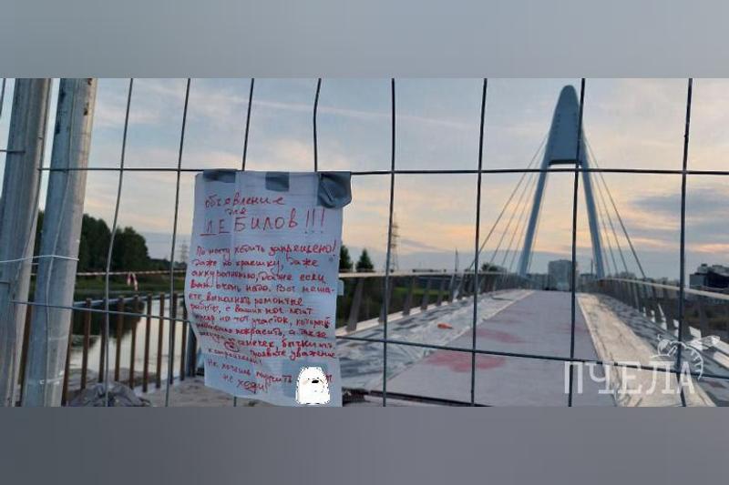 В Челябинске на вантовом мосту, закрытом на ремонт, появилось объявление с оскорбительным обращением к горожанам. На резкие слова «для дебилов» обратило внимание издание Pchela.news.
