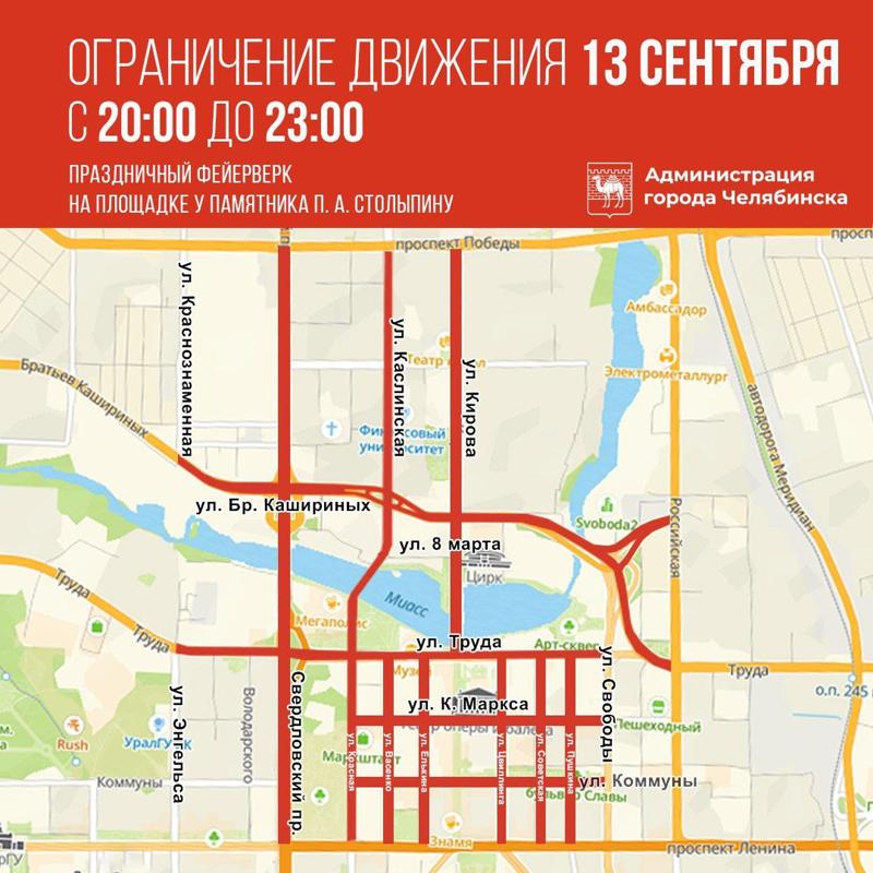 В Челябинске в субботу, 13 сентября, на время праздничных мероприятий, посвященных Дню города, будет полностью закрыто движение транспорта на нескольких участках. Список и схемы предоставили в мэрии.