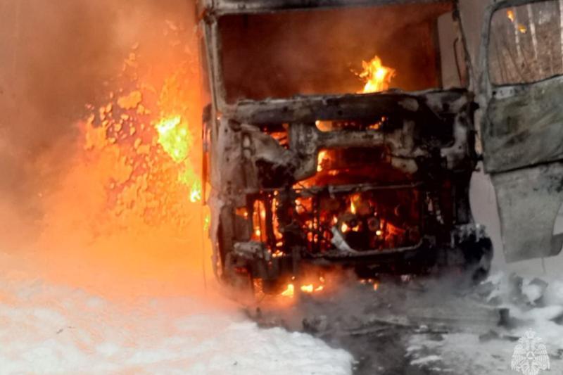 Грузовик загорелся во время движения. Сотрудники МЧС ликвидировали возгорание. Пострадавших нет. Устанавливаются все обстоятельства происшествия.