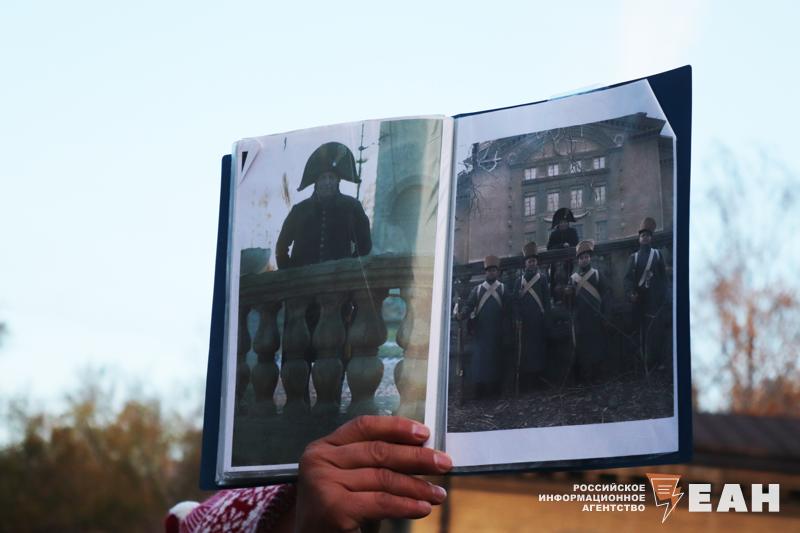 Затем он показывает снимок, на котором возле балюстрады изображен человек, одетый в костюм Наполеона.