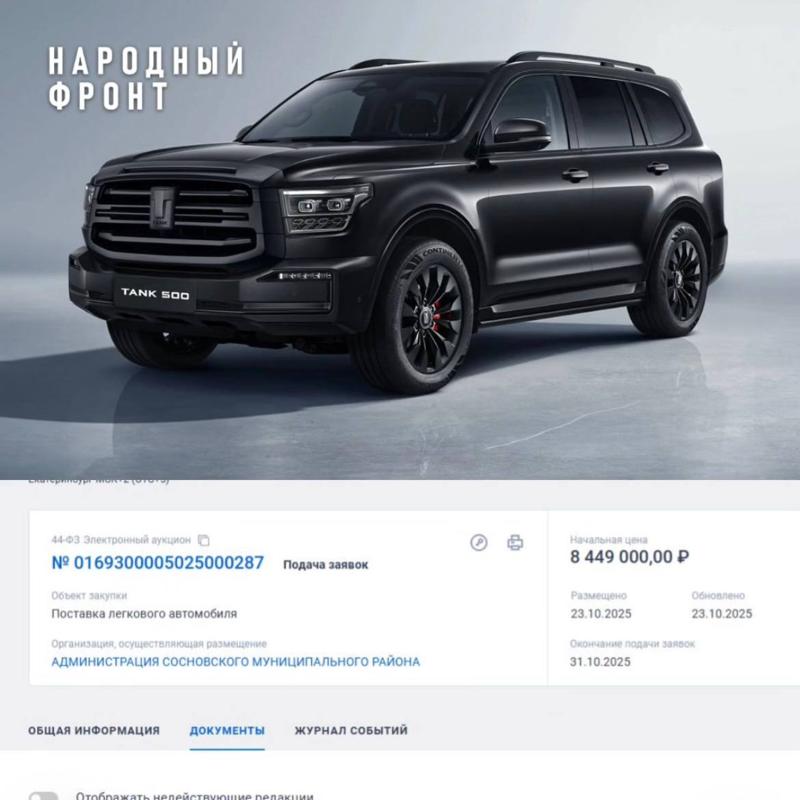 Премиальный внедорожник TANK 500 BLACKTRAIL намерена купить за бюджетные деньги администрация Сосновского района Челябинской области. За китайскую машину на портале госзакупок предлагают максимальную цену – около 8,5 млн рублей.