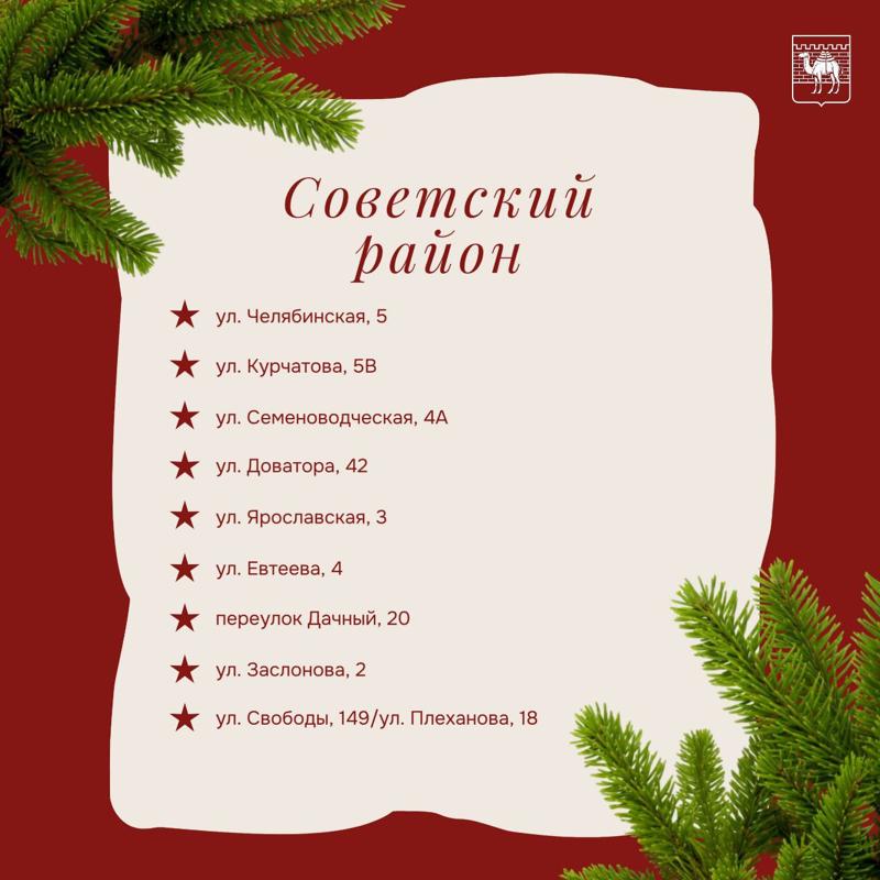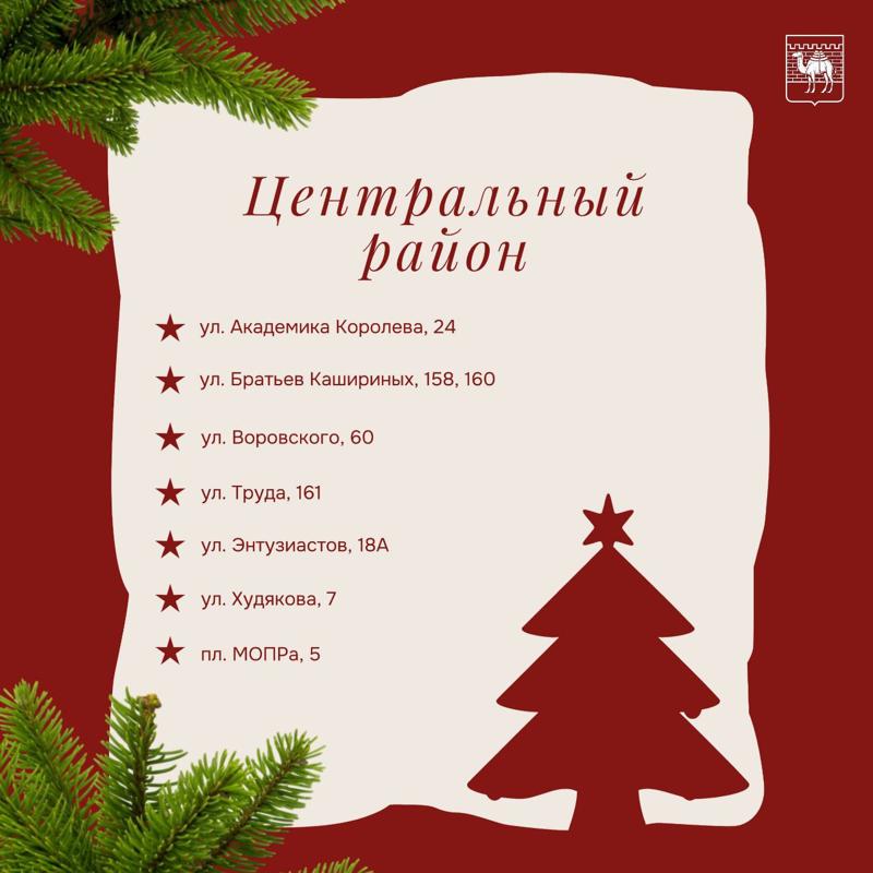 В Тракторозаводском районе елки и сосны можно приобрести на Артиллерийской, Героев Танкограда, Горького, Зальцмана, Комарова, Мамина, Марченко и Чоппа. В Центральном базары работают на Академика Королева, Братьев Кашириных, Воровского, Труда, Энтузиастов, Худякова и площади МОПРа.