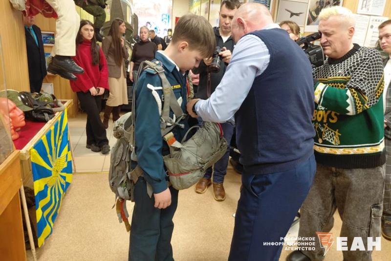 Одному мальчику повезло особенно, его выбрали для примерки комплекта основного и запасного парашютов. Правда, простоял он в этом снаряжении совсем недолго – тяжело было держать на плечах 19 кг.