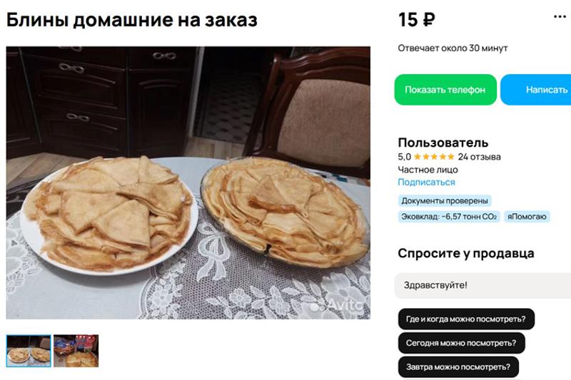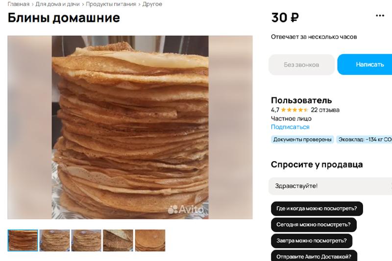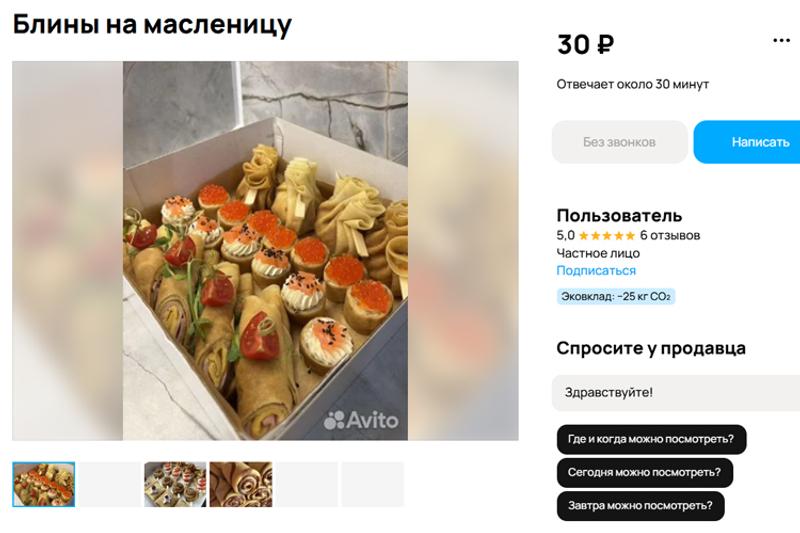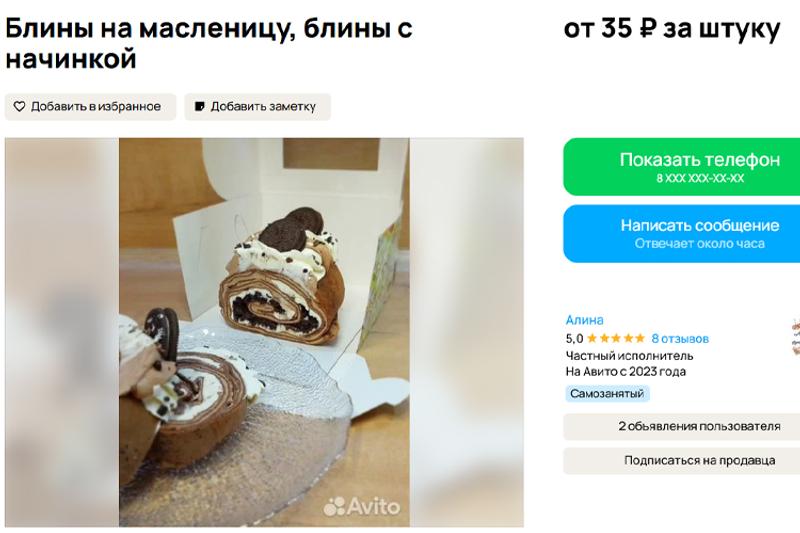 Цены на сладкие блины стартуют от 130 рублей. В качестве начинки предлагают шоколадную пасту, вареную сгущенку. Также на сайте объявлений предлагают приобрести блинные рулеты с кремовой начинкой. За 800 г такого угощения просят 1 тыс. 850 рублей. Самое дорогое предложение на сайте объявлений — бокс с блинами с красной икрой. Его продают за 4,9 тыс. рублей. Автор объявлений не указал, сколько блинов идет в наборе.