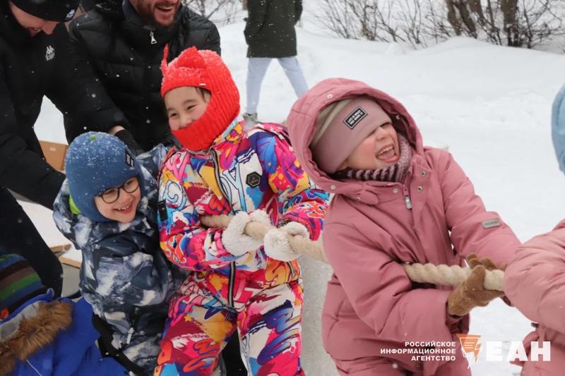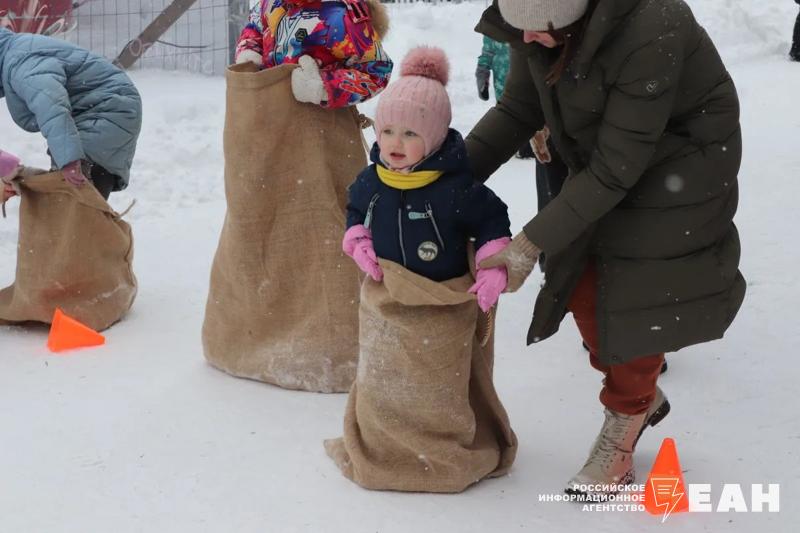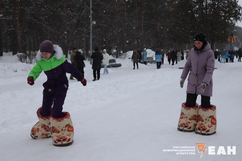 Для гостей праздника организовали традиционные масленичные забавы. Посетители могли посоревноваться в метании блинов и валенок, в беге в мешках и гигантских валенках, а также в перетягивании каната.