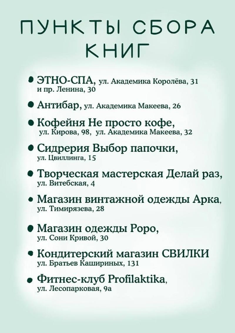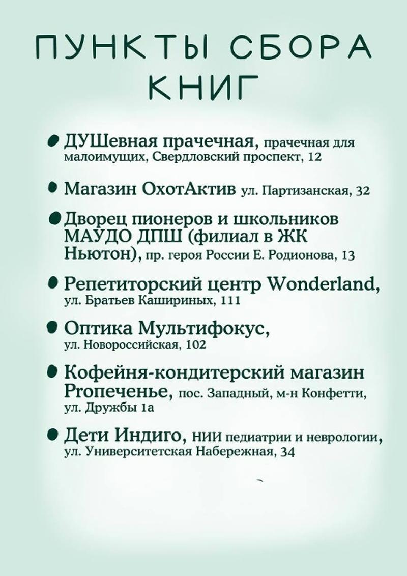 В пунктах принимают издания не старше 2000 года и в хорошем состоянии. Все собранное выставят на продажу. Вырученные деньги направят в АНО «Жизнь», которая реализует проект «Автобус жизни». Волонтеры на этом автобусе, который оборудован как мобильная столовая, в разных местах города кормят обездоленных.