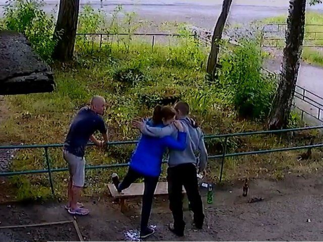 В происходящее вмешивается жилец из подъезда. Тогда компания ставит скамейку на место, убирает за собой мусор и удаляется. Девушка при этом идет сама, опираясь на руку приятеля.