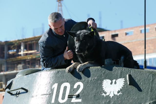 Чем хороша тренировка в отличие от самого парада – глазеть на танки, броневики и даже машины-амфибии сегодня можно было сколько угодно. Ну только подумайте – в детстве многие из нас смотрели и любили польское кино «Четыре танкиста и собака», и мы прекрасно помним одного из главных его героев – тридцатьчетверку с именем «Рудый». А тут приезжаешь утром 30 апреля в Верхнюю Пышму и встречаешь в точности эту же машину – в смысле танк под номером 102, на броне которого сидит настоящая немецкая овчарка. Ну как есть – тот самый Шарик из детского кино.