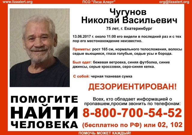 В Екатеринбурге разыскивают 75-летнего Николая Васильевича Чугунова, который пропал 13 июня. Пенсионер нездоров и может не ориентироваться в пространстве. Поисками занимается волонтерский отряд «Лиза Алерт» .