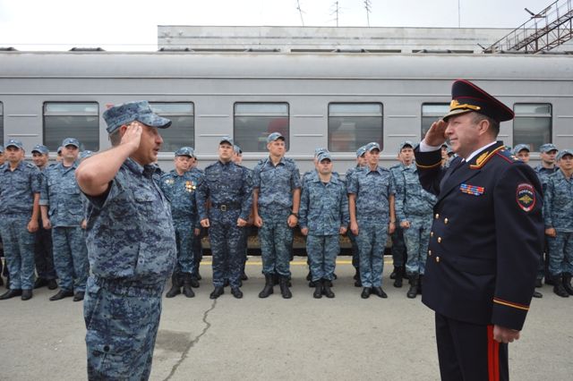 «Сегодня на перрон железнодорожного вокзала Екатеринбурга пассажирским поездом с территории Северного Кавказа вернулся сводный отряд свердловского гарнизона полиции численностью более 100 человек. Командовал группой начальник ОМВД по Североуральску подполковник полиции Артур Салямов. Командиром эшелона был полковник внутренней службы из УРЛС ГУ МВД области Владимир Лемещук. Вместе с силовиками из полугодовой командировки домой прибыли и две служебно-розыскных собаки Мона Лиза и Абрек», — рассказал пресс-секретарь регионального полицейского ведомства Валерий Горелых.