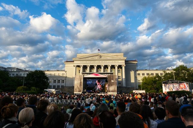 На площади перед УрФУ собрались тысячи екатеринбуржцев и гостей города. Еще до начала мероприятия все места как под открытым небом, так и на трибунах были заполнены. На живой концерт группы Philharmonix пришли люди самых разных возрастов – дети с родителями, молодежь, пенсионеры. Артистов встречали бурными аплодисментами. И не случайно: известный в мировой культуре коллектив посетил Екатеринбург впервые. Трое музыкантов из Венской филармонии и четверо из Берлинской никогда не планируют свое выступление заранее – они выходят на сцену и играют на волне настроения публики. Коллектив исполняет как классическую музыку, так и джазовые, латино и поп-произведения. Настроение уральцев музыкантам тоже удалось уловить: зрителям настолько понравился концерт, что «великолепную семерку» из Вены они вызывали на бис, аплодируя артистам стоя.