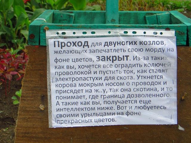 «Проход для двуногих козлов, желающих запечатлеть свою морду на фоне цветов, закрыт. Из-за таких, как вы, хочется оградить все колючей проволокой и пустить ток, как ставят электропастухи для скота. Уткнется корова мокрым носом о проводок и присядет на ж..у, так она, скотина, и то понимает, где граница дозволенного. А такие, как вы, получается, еще интеллектом ниже. Вот и любуетесь своими урыльцами на фоне прекрасных цветов», — говорится в объявлении.