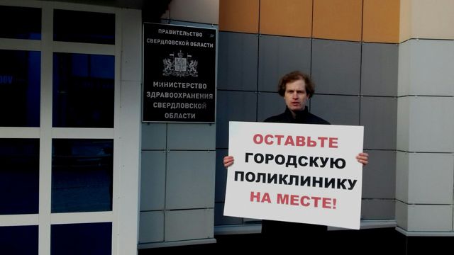 В Екатеринбурге возле здания областного минздрава состоялся одиночный пикет ирбитского общественника Алексея Кононова. Мужчина выступает против переноса поликлиники в своем городе в другое место. По его словам, больницу хотят перевести в гораздо менее удобную для горожан часть города, а чиновники отделываются от них отписками.