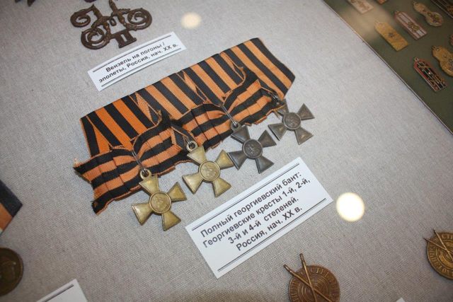 Помимо полного банта солдатского Георгия, в экспозиции разместилась серия воинских и памятных медалей, в том числе и самая массовая медаль дореволюционной России, выпущенная к 300-летию дома Романовых, - коллекция памятных жетонов-погончиков, которые можно сравнить с современными брелоками, а также холодное оружие со златоустовской гравюрой.