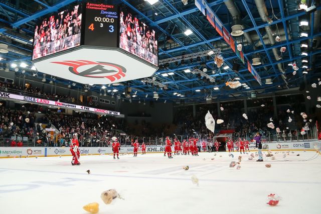 После финального гудка болельщики «Автомобилиста» выбросили на лед подготовленные заранее мягкие игрушки. Благотворительная акция «мишкопад», организованная в поддержку «Живого театра» Александра Пантыкина, стала для уральских любителей хоккея привычным мероприятием. Собранные игрушки будут направлены нуждающимся семьям и сиротам.