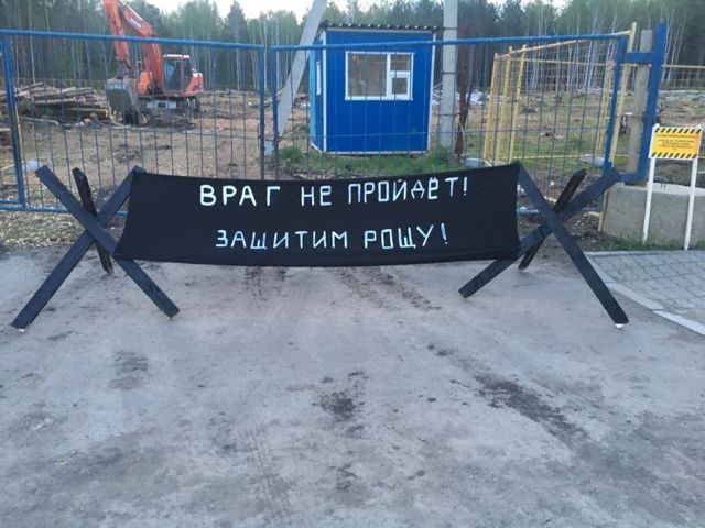 Они появились на улице Краснолесья, где ранее поставили забор без опознавательных знаков. Вместе с ежами появился и баннер «Враг не пройдёт! Защитим рощу!», а рядом – еще табличка «"Атомстройкомплексу" въезд на территорию березовой рощи строго запрещается».
