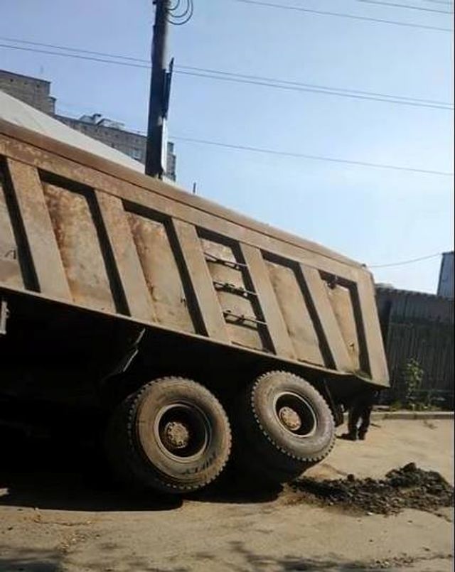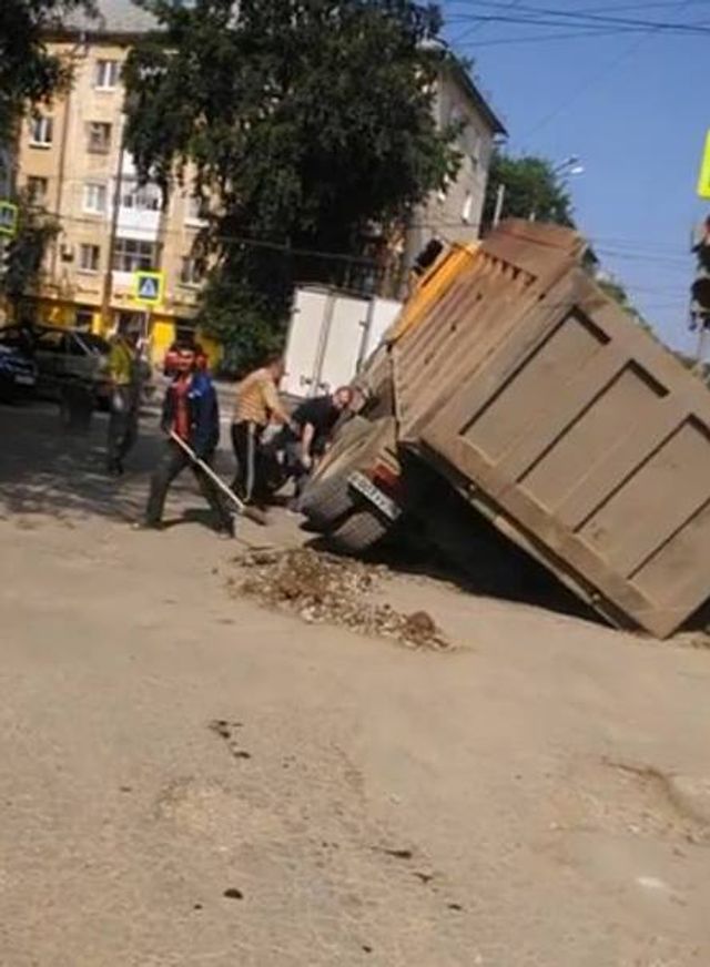 По его словам, грузовой автомобиль столкнулся с препятствием возле ТЦ «Омега». Видимо, машина ехала порожняком и провалилась в яму задними колесами.