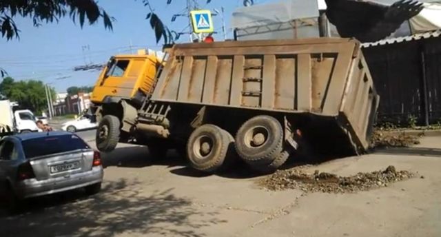Для извлечения грузовика потребовался экскаватор. Примечательно, что рабочие, которые пытались вызволить машину из ямы, были крайне недовольны тем, что прохожие снимали происходящее на видеокамеры.