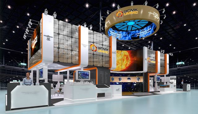 Общая площадь двухэтажного стенда УГМК составляет 220 кв. м. Экспозиция расположена в третьем павильоне выставочного комплекса «Екатеринбург-Экспо».