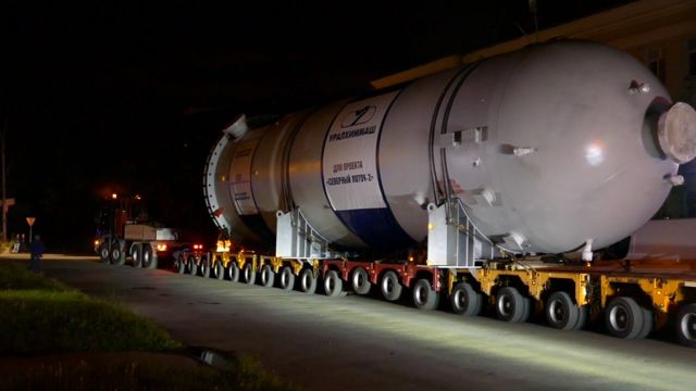 Адсорберы - сложные аппараты для очистки газа, изготовлены на заводе «Уралхиммаш» для КС «Славянская» (Кингисеппский район Ленинградской области). Два автопоезда, на которых перевозят оборудование, состоят из специальных транспортеров, каждый из них обслуживают два тягача для «перехвата» грузовика при поворотах, а сопровождают машины прикрытия и трал с необходимым оборудованием.