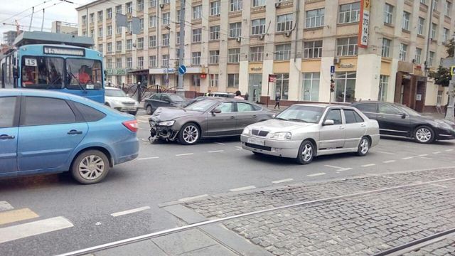 В центре Екатеринбурга на перекрестке улиц Ленина и Карла Либкнехта столкнулись две иномарки. Как сообщают очевидцы, девушка - водитель Audi, проезжала по Ленина и врезалась в бок автомобиля Skoda, выполнявшего поворот на улицу Карла Либкнехта.