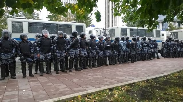 Сюда смогли дойти порядка 100 демонстрантов, после чего полицейские выстроились стеной и взяли протестующих в кольцо. Из окружения полиция никого из активистов не выпускает. На данный момент задержано несколько человек.
