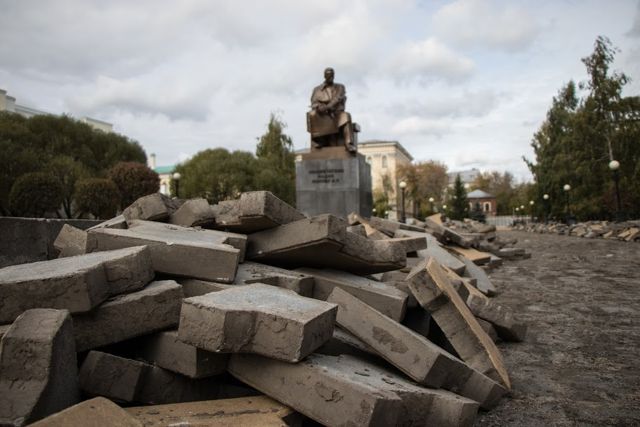 В связи с проведением работ подрядчик перекрыл практически весь сквер. Пройти с проспекта Ленина к резиденции главы региона теперь можно лишь по узкой тропинке вдоль стен Главпочтамта и здания архива. Бехатоновое покрытие и асфальтовые дорожки полностью демонтированы.