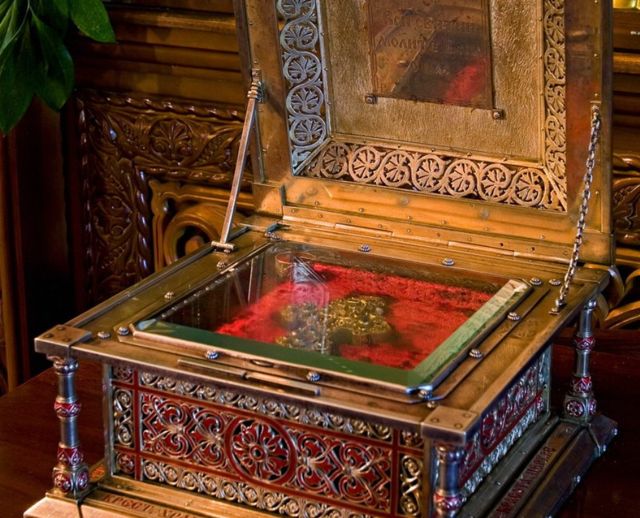 «На обратной стороне креста выгравированы слова: "Часть ризы Господни, часть ризы Пресвятыя Богородицы, Животворящее Древо Креста Господня..." Здесь также перечислены 40 угодников Божиих, чьи святые мощи хранятся в кресте-мощевике: Пророка, Предтечи и Крестителя Господня Иоанна, апостола Андрея Первозванного, праведного Лазаря Четверодневного, святителей Василия Великого, Григория Богослова и Иоанна Златоустого, преподобного Сергия Радонежского и других угодников Божиих», - рассказывают в епархии.