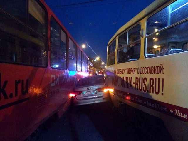 Как сообщают очевидцы в соцсетях, иномарку зажало между вагонами, один из которых следовал по маршруту № 10 (в сторону цирка), второй – по маршруту № 32 (в сторону улицы Радищева).