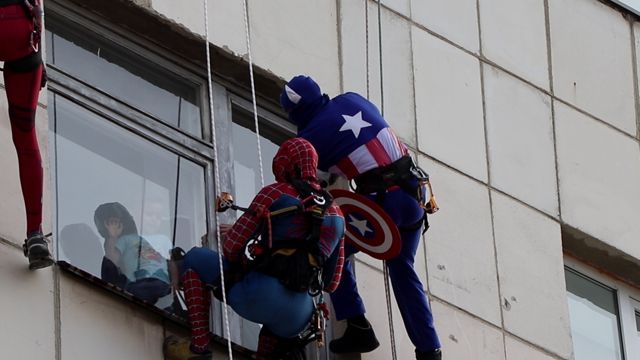 Промышленные альпинисты Екатеринбурга, переодевшись в персонажей популярных комиксов, спустились по стене Детской областной клинической больницы и устроили небольшое представление перед окнами палат. Для детей происходящее стало сюрпризом.
