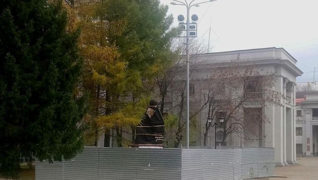 В центре Екатеринбурга почти закончено возведение памятника, о котором еще никто ничего не знает. Скульптура, пока еще покрытая тканью, появилась возле Окружного дома офицеров.