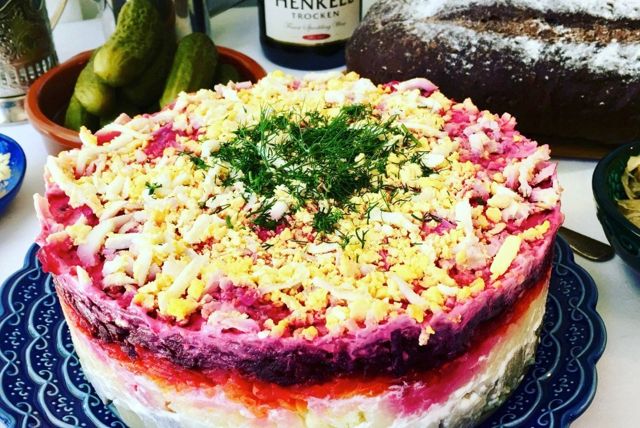 Для другого новогоднего блюда, селедки под шубой, необходимы соленая сельдь (350 гр.), картофель (400 гр.), столовая свекла (350 гр.), морковь (200 гр.), репчатый лук (100 гр.), майонез (300 гр.). Год назад набор был равен 152 рублям, в этом он практически не изменился – 154 рубля. Снизилась стоимость самого главного ингредиента – сельди, но в то же время подорожала свекла — на целых 25%.