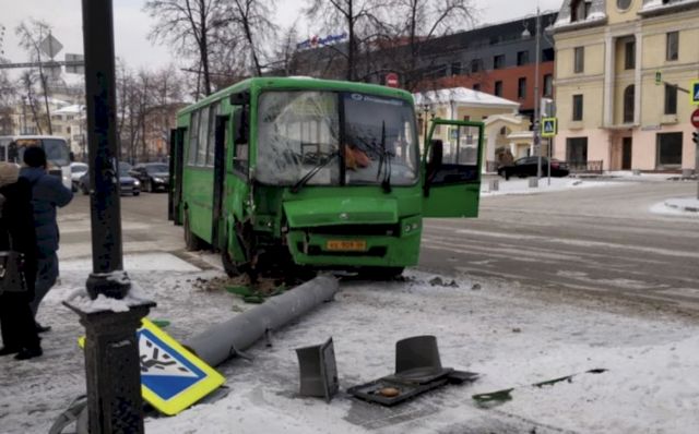 Авария произошла на перекрестке с улицей Сакко и Ванцетти. Маршрутку серьезно покорежило, столб упал на тротуар. Очевидцы сообщают о пострадавших.