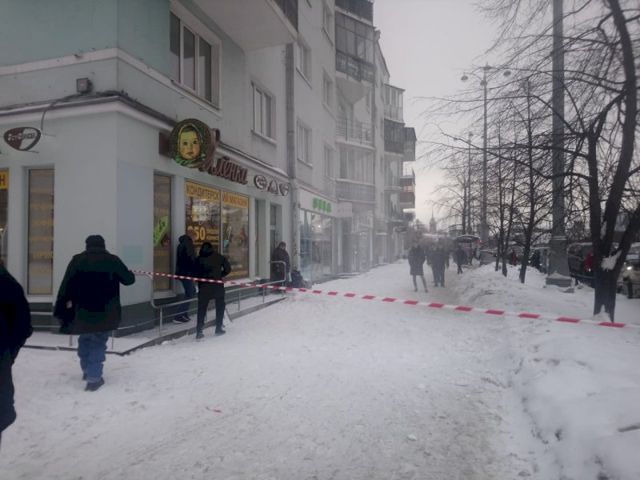 В центре Екатеринбурга на перекрестке Толмачева-Ленина сотрудники управляющей компании перекрыли пешеходную часть проспекта у дома № 36, чтобы очистить крышу от наледи и накопившегося снега.