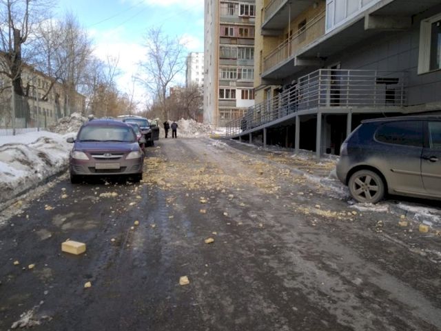 Площадь обрушения составила 2 кв. м. Пострадавших среди людей нет, но повреждены два автомобиля.