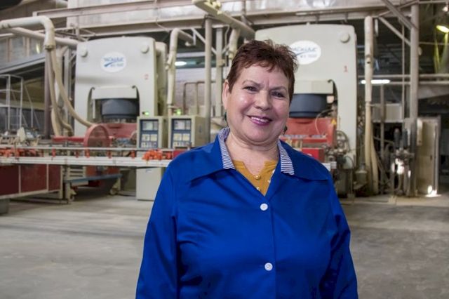Валентина Васильевна пришла на завод в 1963 году, тогда большое предприятие находилось в стадии стройки, был запущен один цех. Восемнадцатилетняя девушка встала к прессу – огромному механизму, который прессует порошок в плитки. Глядя сегодня на автоматические гидравлические прессы и конвейер, Валентина Васильевна поражается переменам, свидетелем которых она стала за эти годы: «Это были простейшие прессы, их называли коленорычажные. Мы, женщины, загружали в них порошок и мыли с водой, когда пресс забивался, и линия останавливалась. Такое случалось часто. За восьмичасовую смену уставали невероятно. Порошок и пыль были везде. Сейчас все очень изменилось».