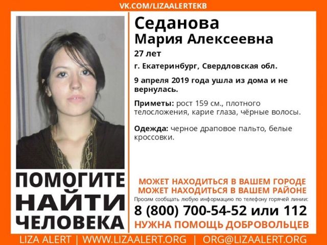 В Екатеринбурге разыскивают 27-летнюю Марию Седанову.