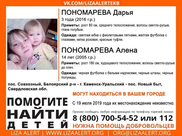 В Каменске-Уральском пропали две сестры – Алена и Дарья Пономаревы, 14 и 3 года соответственно, сообщает поисковый отряд «Лиза Алерт».