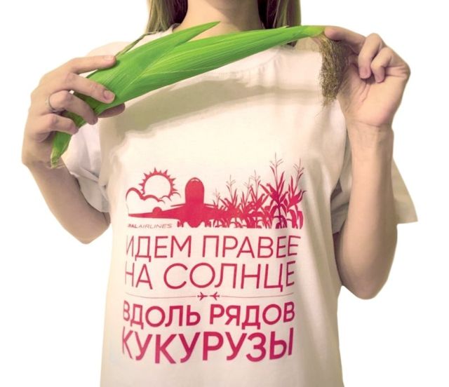 Перевозчик представил сувенирную продукцию: футболки с культовой фразой бортпроводника Дмитрия Ивлицкого «Идем правее, на солнце, вдоль рядов кукурузы». Они появились в продаже.