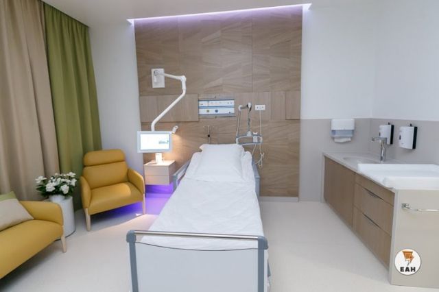 При проектировании родильного отделения специалисты клиники объехали лучшие роддома Европы. Этот роддом абсолютно не похож на больницу: в палатах создан по-настоящему домашний уют. Есть даже апартаменты, в которых в одном помещении будущая мама отдыхает, а в смежной комнате находится родовой зал со всем необходимым оборудованием. При этом все, что может вызвать стресс, «спрятано» от глаз. Так, все медицинское оборудование в родовых скрыто за стеллажами – его достают по мере необходимости. Операционные лампы тоже убрали с потолка, чтобы ничего не напоминало больницу. Когда начинаются роды, женщина переходит в зал, а после уже с малышом возвращается обратно в знакомое помещение.