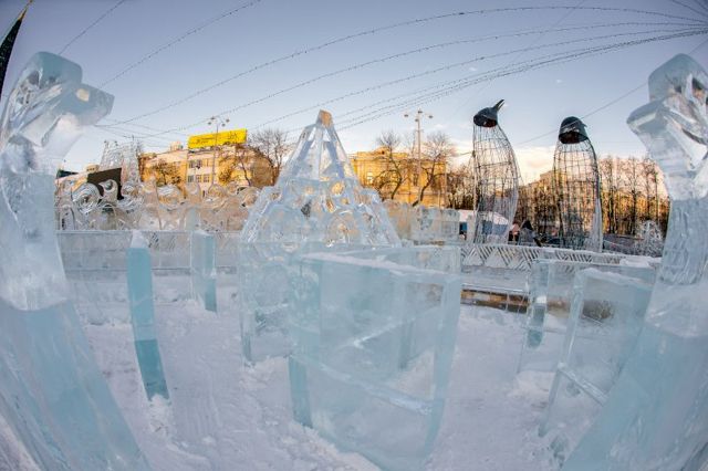 В основе площадки - ледовые скульптуры, ледяные лабиринты и горки. Последних в этом году шесть: две большие, две средние и две совсем маленькие.