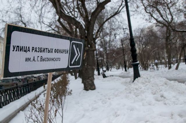 Напомним, реконструкция сквера у Оперного театра была закончена в декабре. Часть из установленных здесь фонарей была разбита неизвестными. Журналисты портала 66.ру отреагировали на это установкой табличек «Улица разбитых фонарей им. А.Г. Высокинского», что вызвало негодование администрации города.